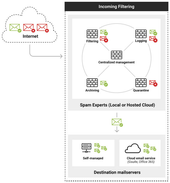 All services can be deployed on our redundant cloud infrastructure or locally on your (virtualized) hardware. The services run in front of, and independent of, your email infrastructure.